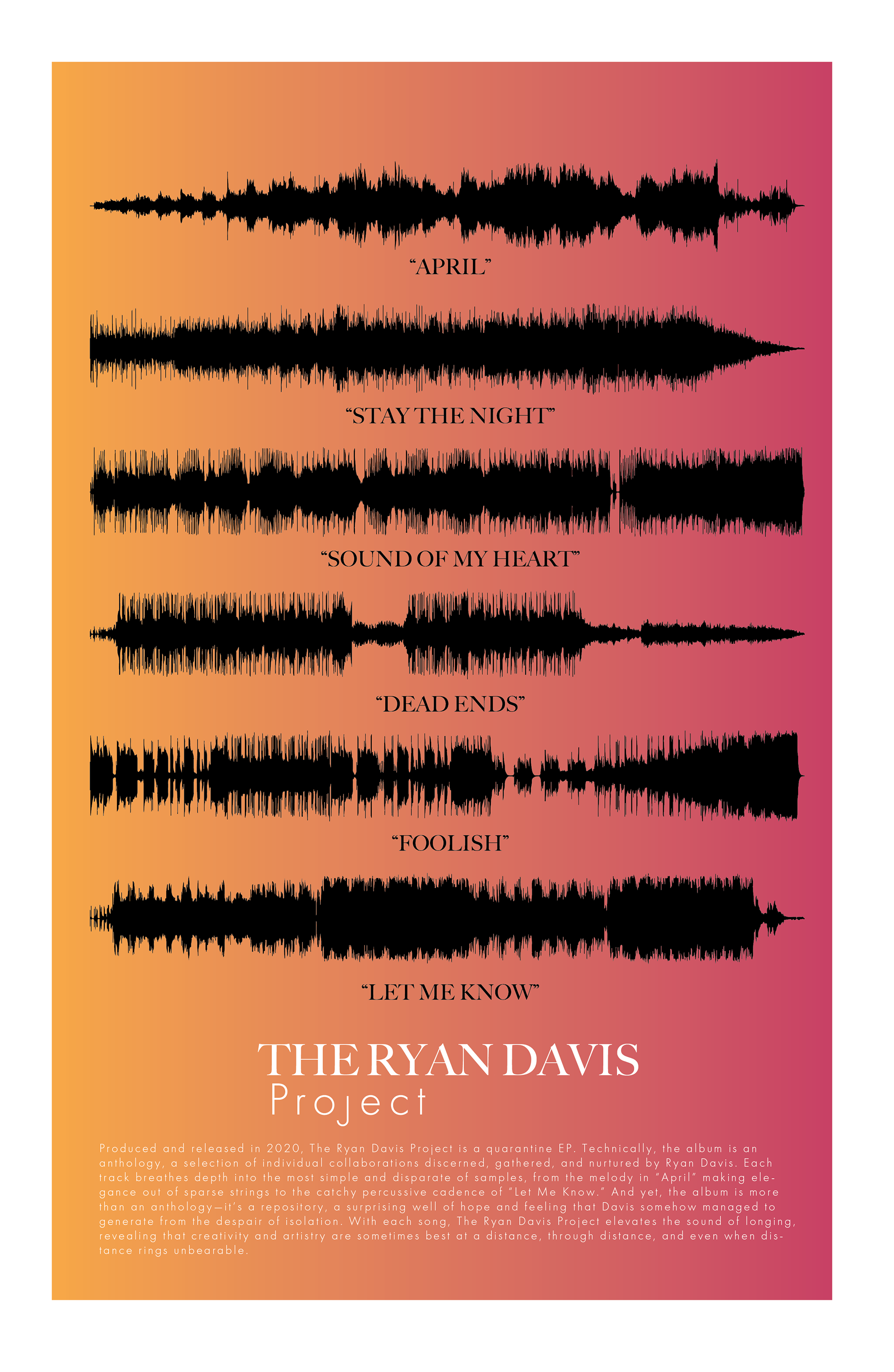 Produced entirely remotely over Covid-19 lockdowns, The Ryan Davis Project was the debut solo album from producer/musician Ryan Davis. I was commissioned to design the album artwork for the project.